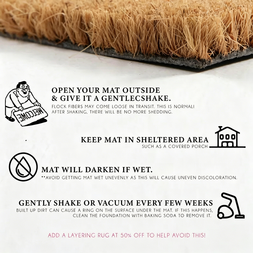 *Shipping & Handling Notes:* Upon delivery, please open the package outdoors. A small amount of loose fibers may shed during transit. Please remove the doormat carefully and shake it gently (avoid vigorous shaking); as the mat is heavy, improper handling could result in tearing.