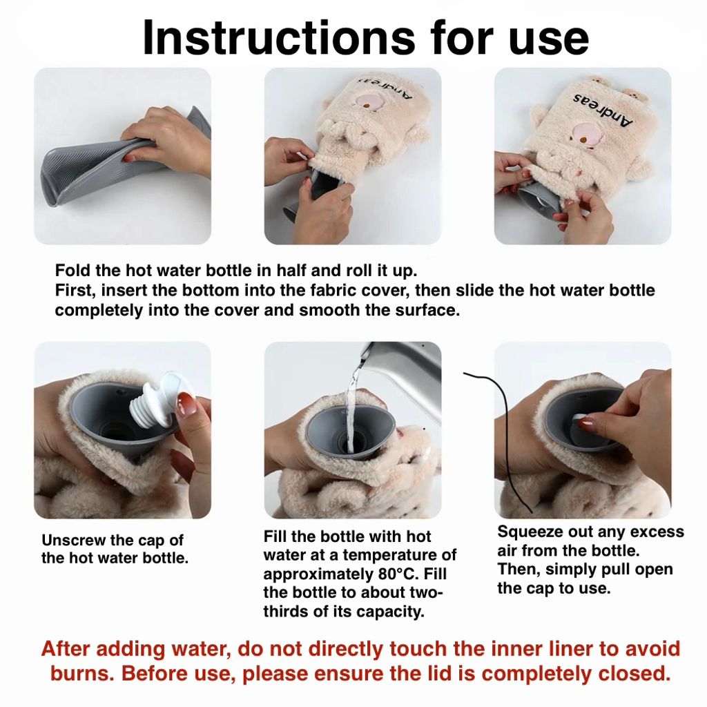 This hot water bottle is perfect for relieving menstrual cramps, muscle and back pain, or simply for keeping warm. You can use it comfortably at home on the sofa or bed, warm your hands and knees in the office, or use it as a sleep aid to create a cozy sleeping environment – flexibly adapting to various daily scenarios.