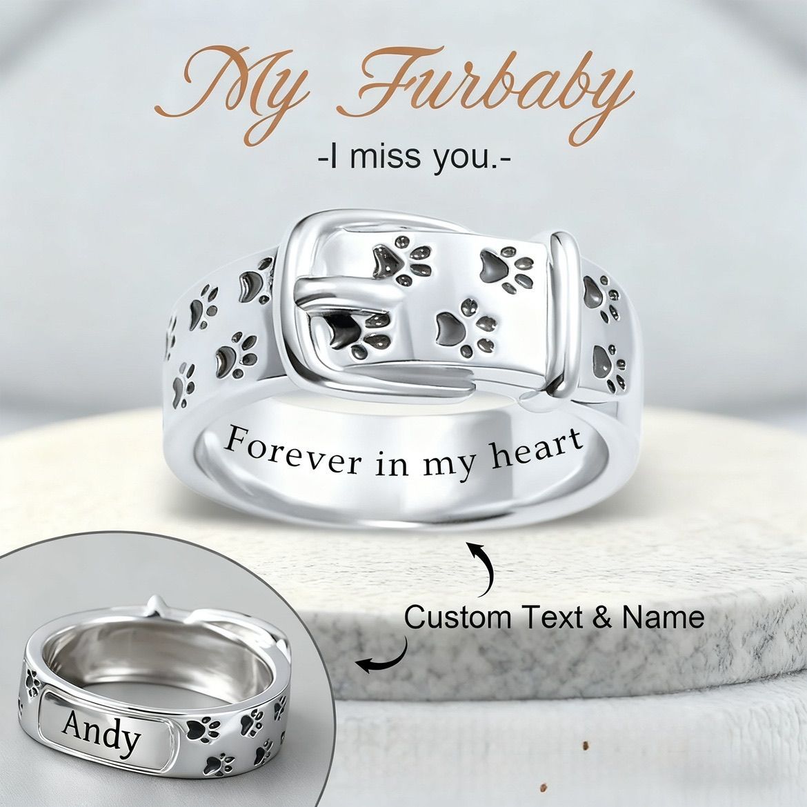 Honor the bond with your beloved pet with our personalised paw print memorial ring-a timeless trinket that you can personalise with your pet's name and a heartfelt message. Carefully crafted to reflect both the unique journey together and the emotional connection, this ring becomes a lasting symbol of love, memory and celebration of a beloved life. With his fine details and personal touch, he tells a story as unique as the bond he represents.