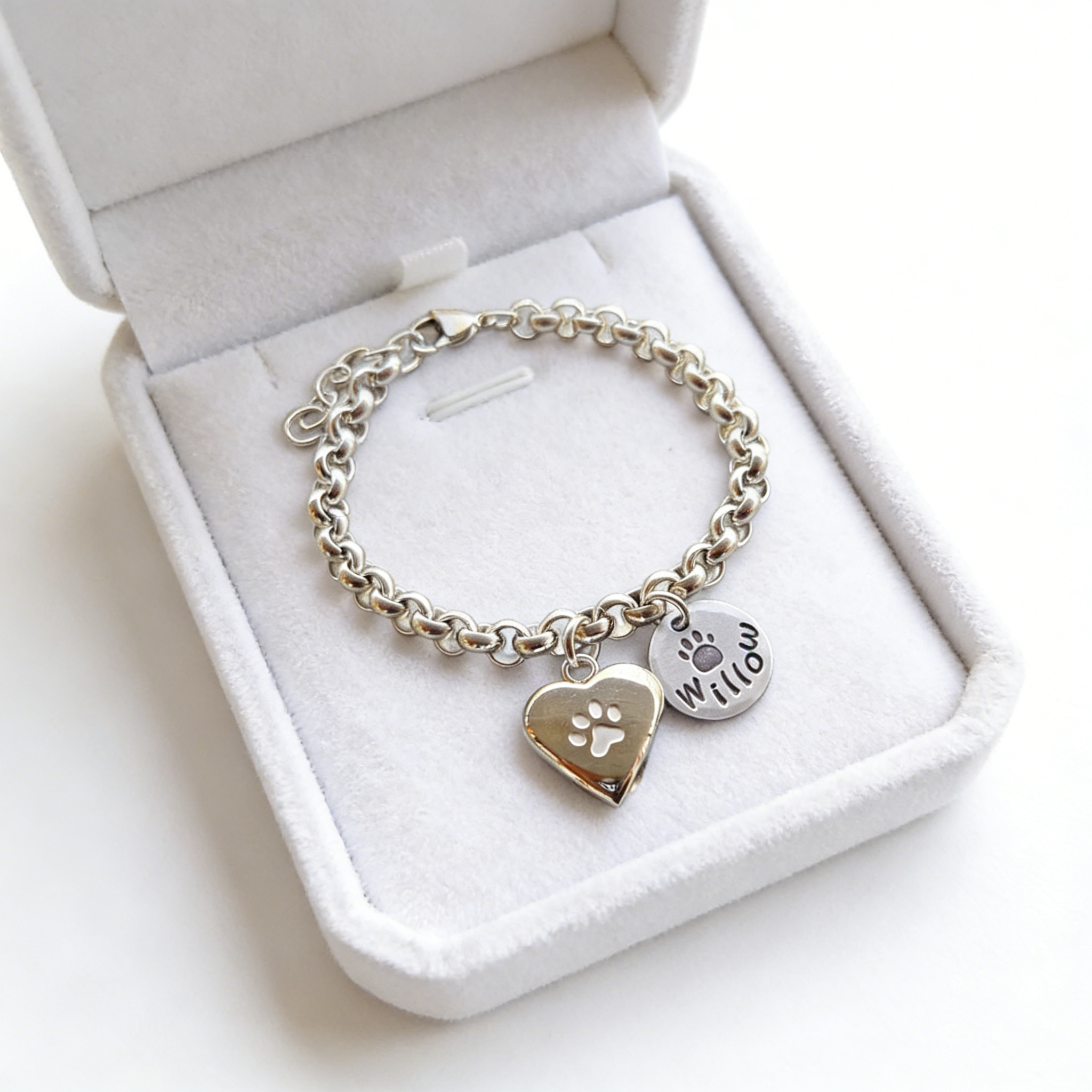 Have your pet's name hand-stamped onto the circular charm, and select a paw print design to honor their unique identity. These custom details transform a simple bracelet into a one-of-a-kind keepsake, celebrating the special bond you share with your dog or cat, and turning grief into a tender, wearable reminder of love.