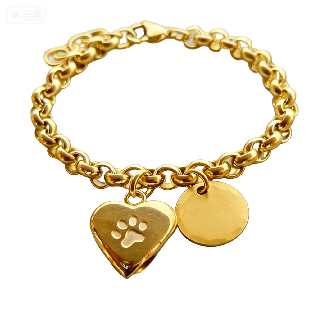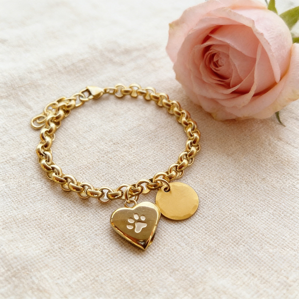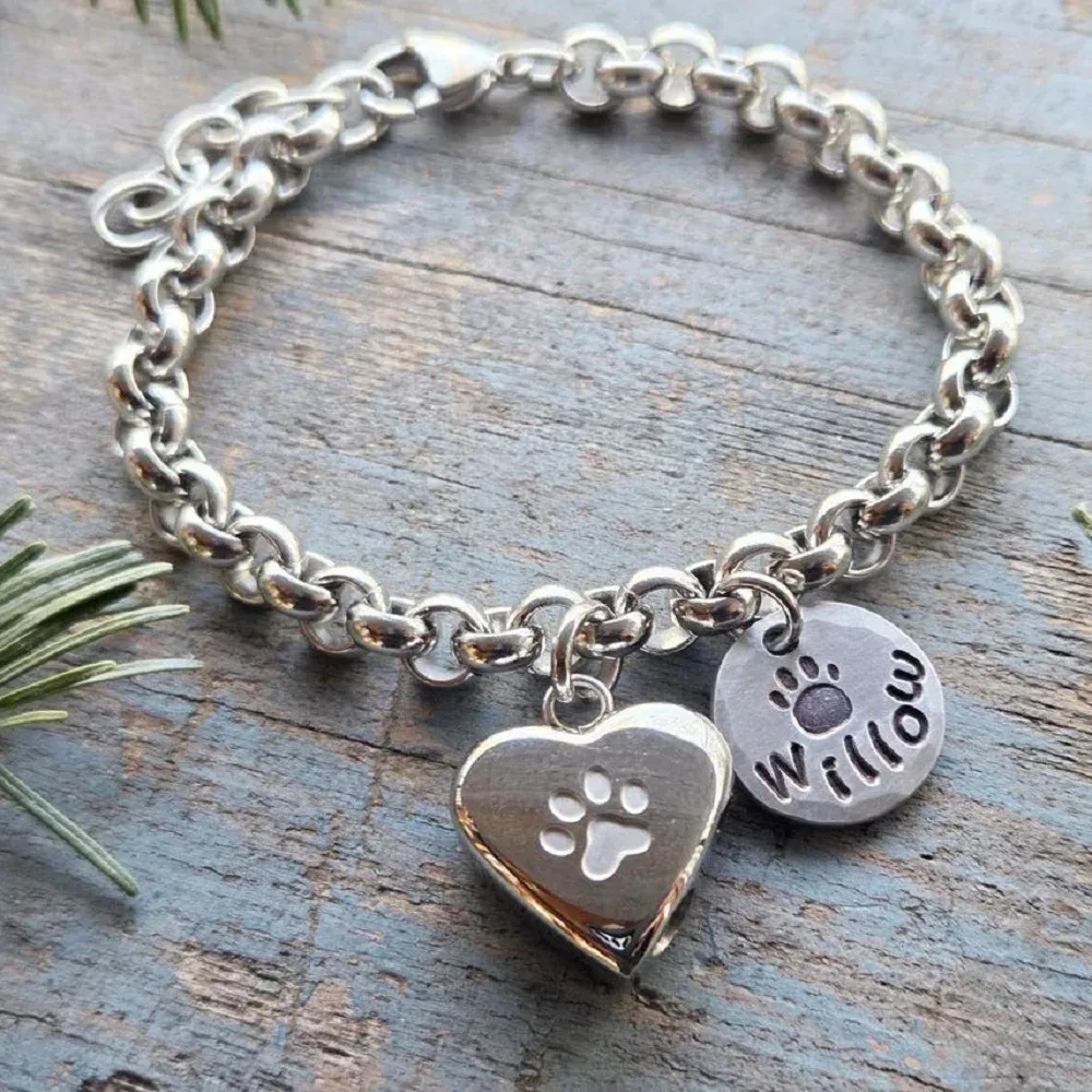 This personalized pet bracelet features a delicate stainless steel heart-link chain paired with a hand-stamped paw print charm—engraved with your pet's name—creating a wearable keepsake that keeps your beloved furry friend by your side forever. It perfectly blends heartfelt symbolism with an elegant, understated style.