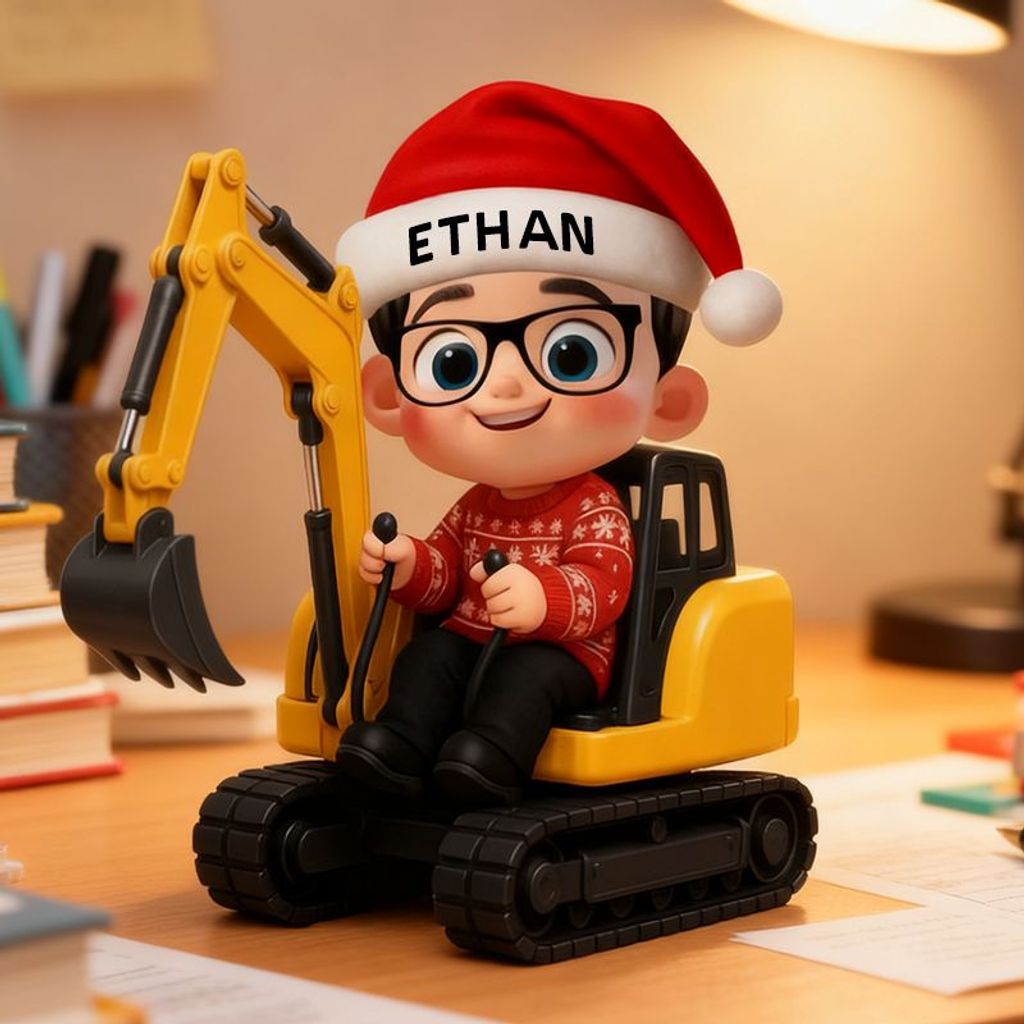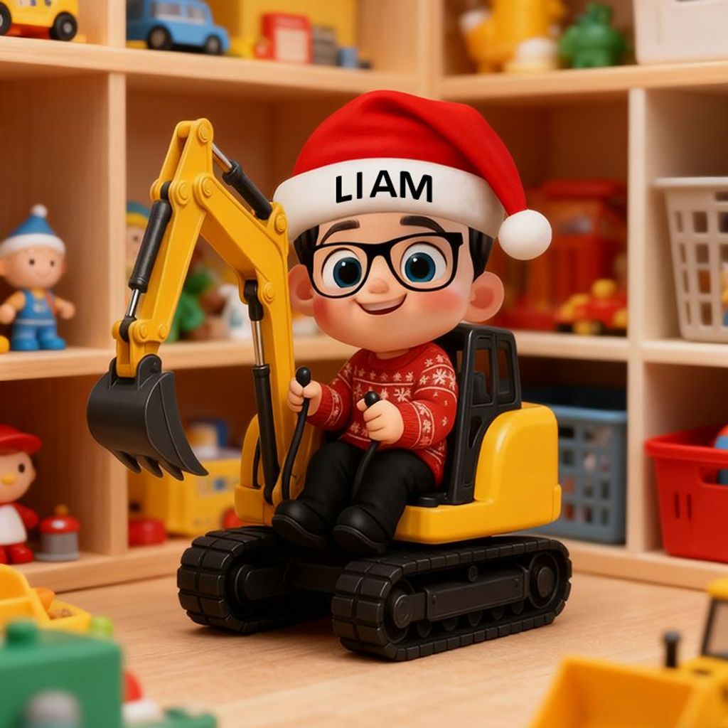 This unique piece showcases a cheerful little boy in action, masterfully driving his favorite fleet: a powerful excavator, a sturdy tractor, and a cool car. It's not just a toy; it's a custom-crafted keepsake that captures his spirit and imagination in exquisite detail.
