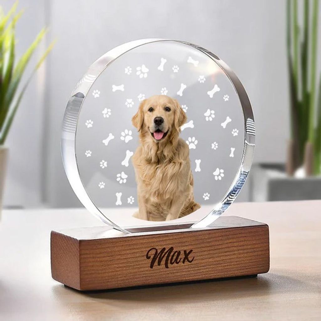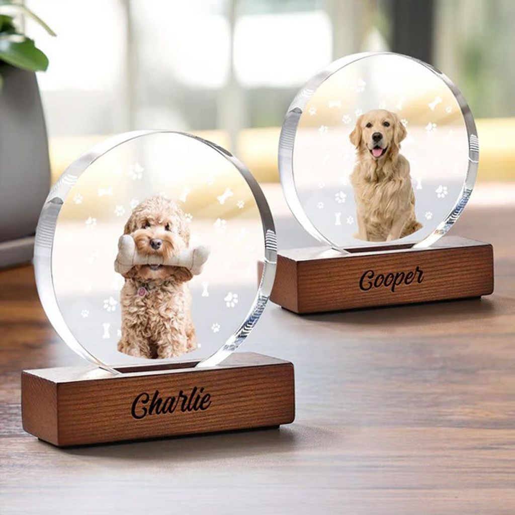 This personalized round acrylic photo frame is designed for dog lovers. It is centered on dog photos and decorated with cute bones to leave precious memories for your furry children. You can upload photos of your beloved dogs and customize the dog's name to make this gift unique and full of emotion.
